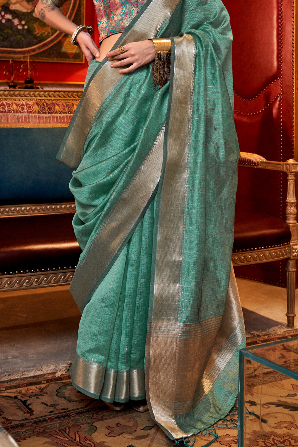 This elegant sage green banarasi georgette saree features a heavy jacquard blouse, adding a touch of sophistication to your ensemble. The intricately woven pattern and rich color make this saree a timelessly beautiful addition to your wardrobe. Elevate your style with this luxurious piece.
