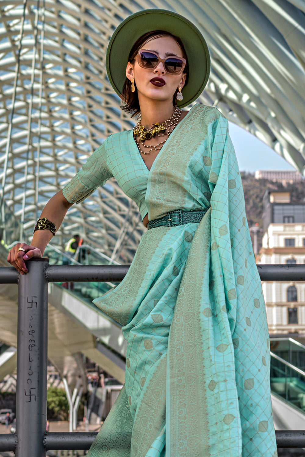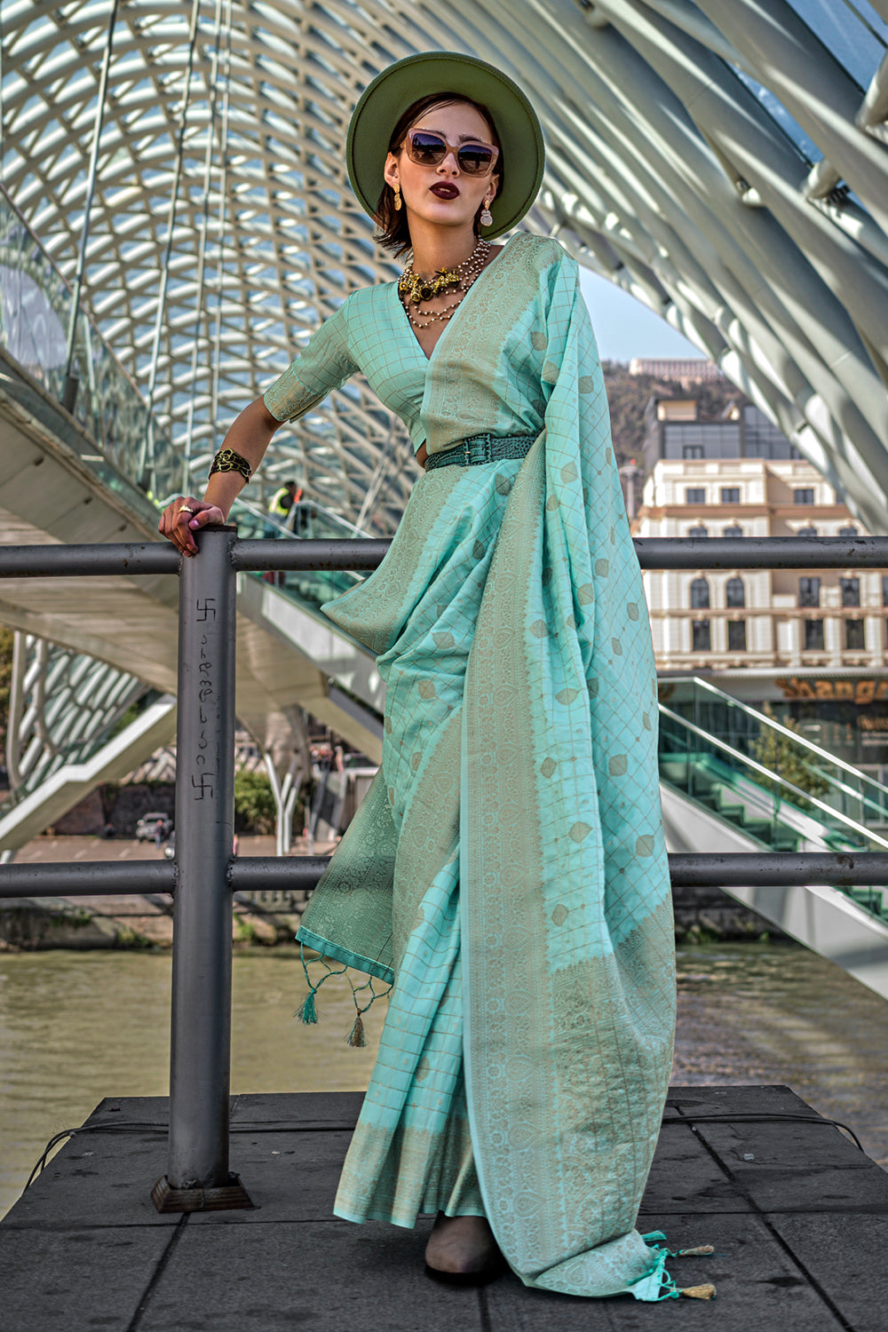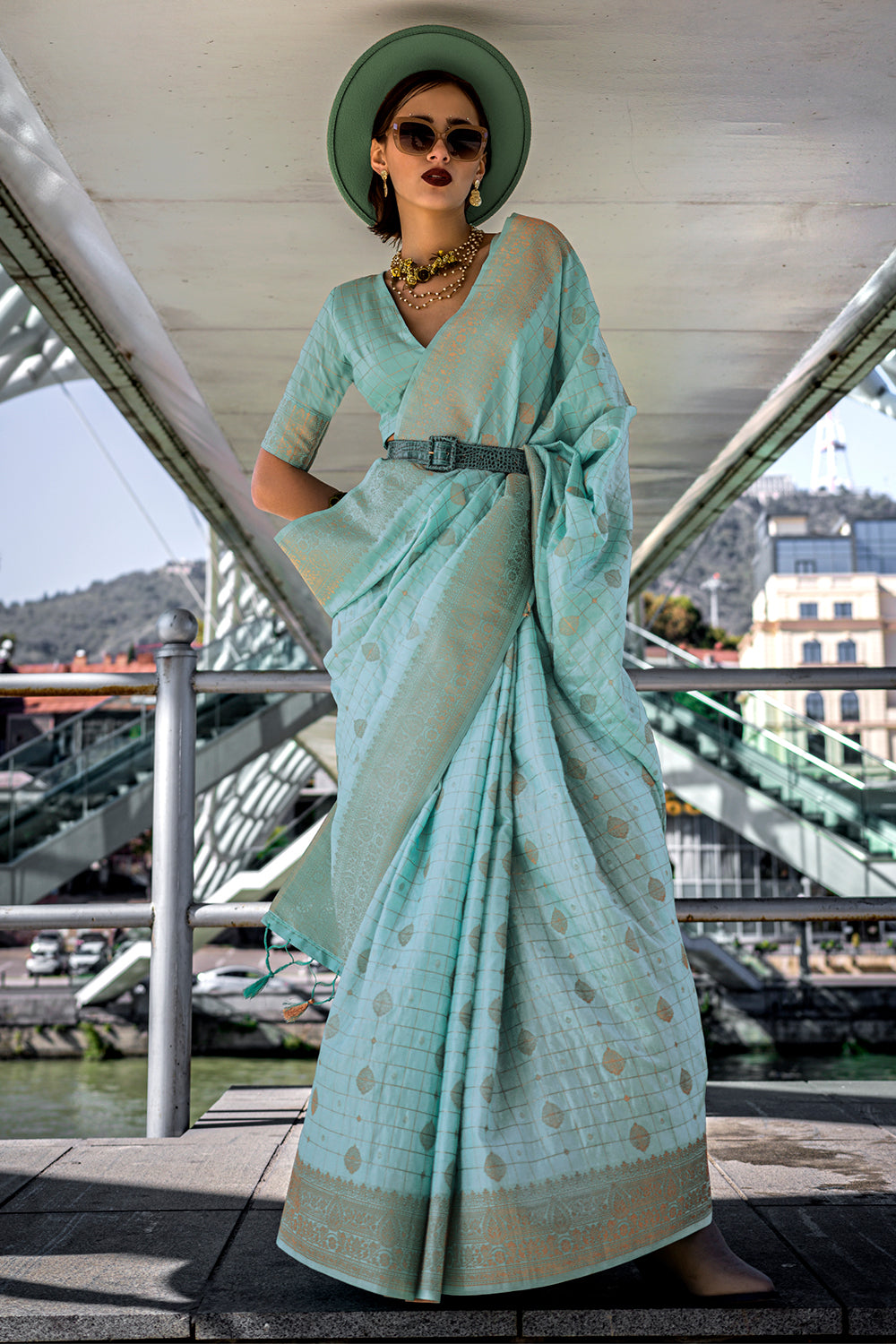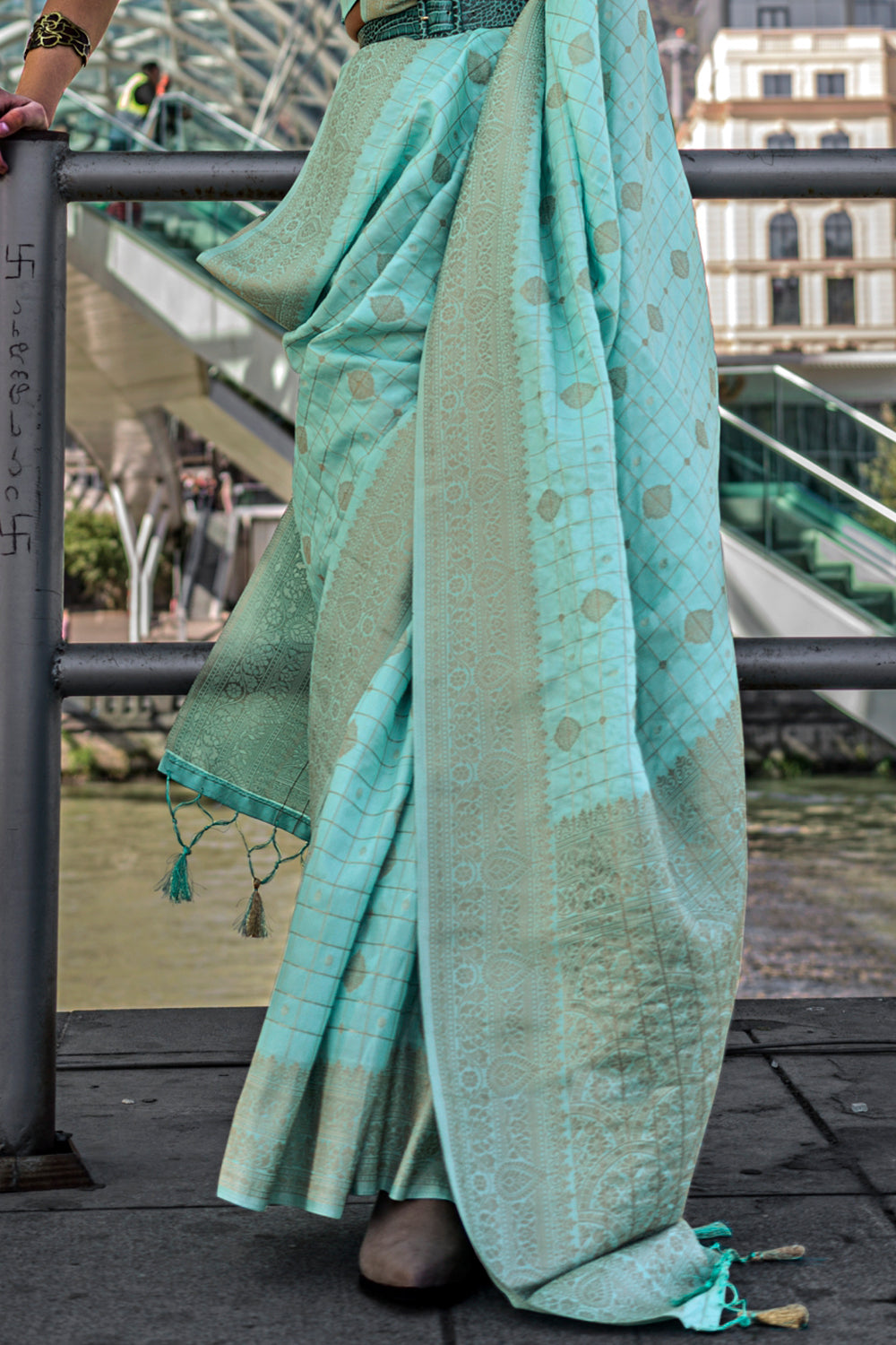 Sea Green Katan Banarasi And Checks Saree With Blouse