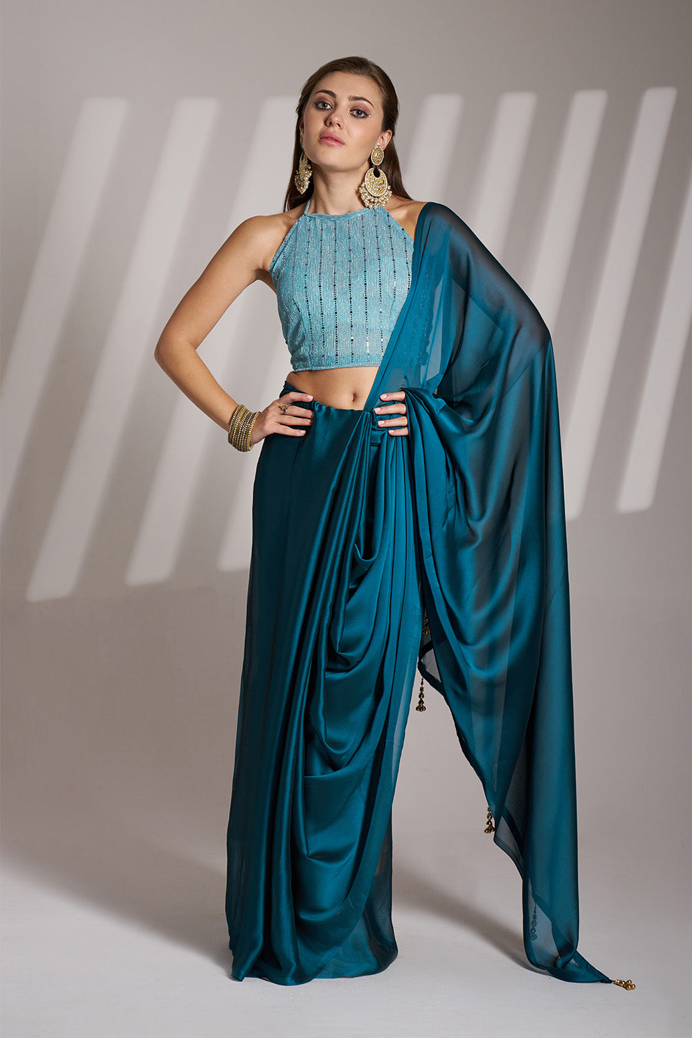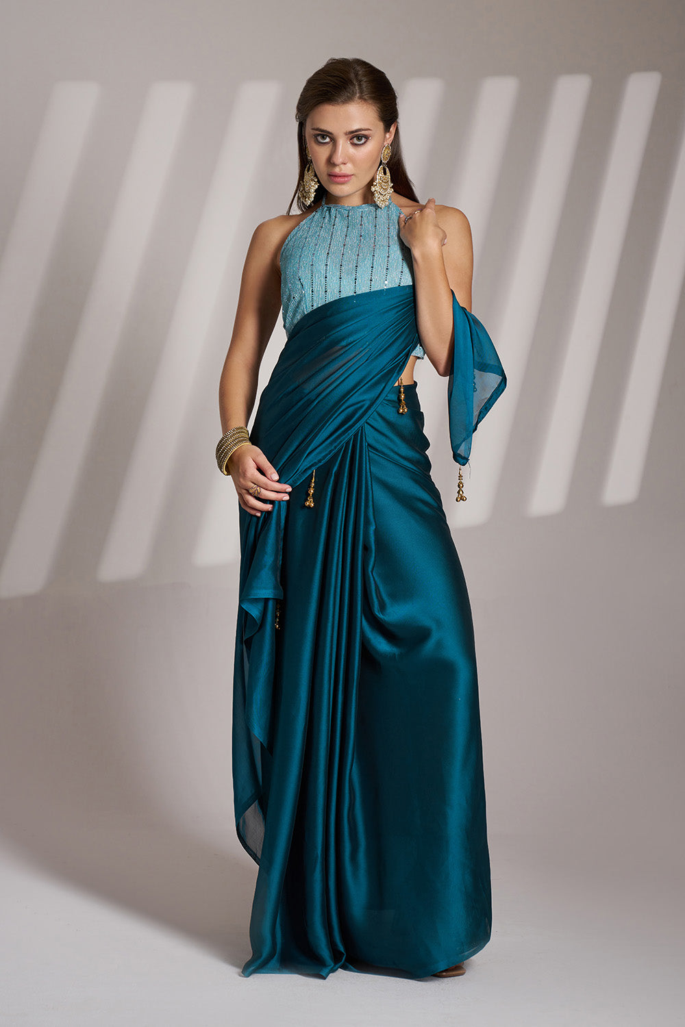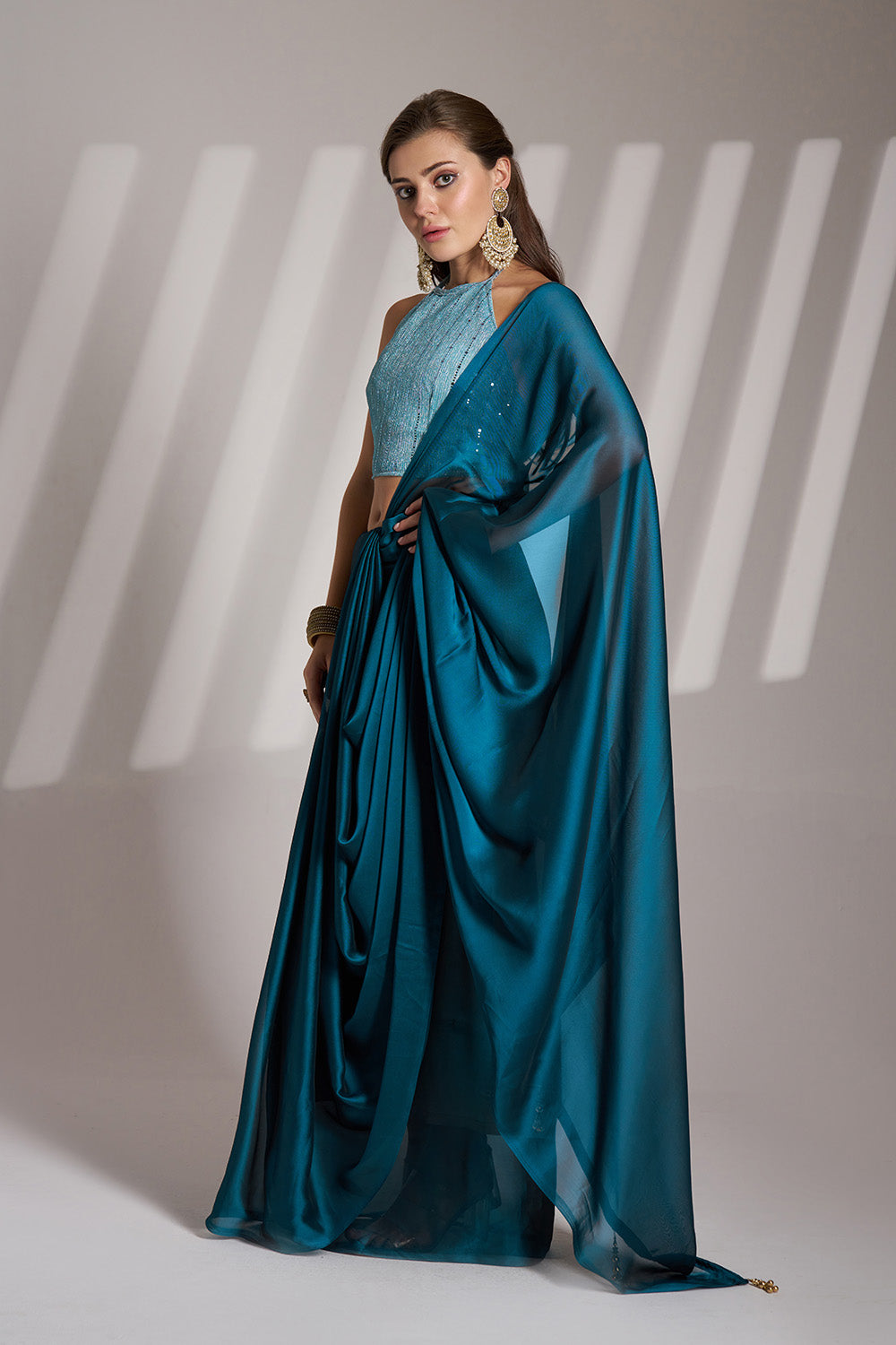 Teal Blue Satin Saree With Tassels And Blouse