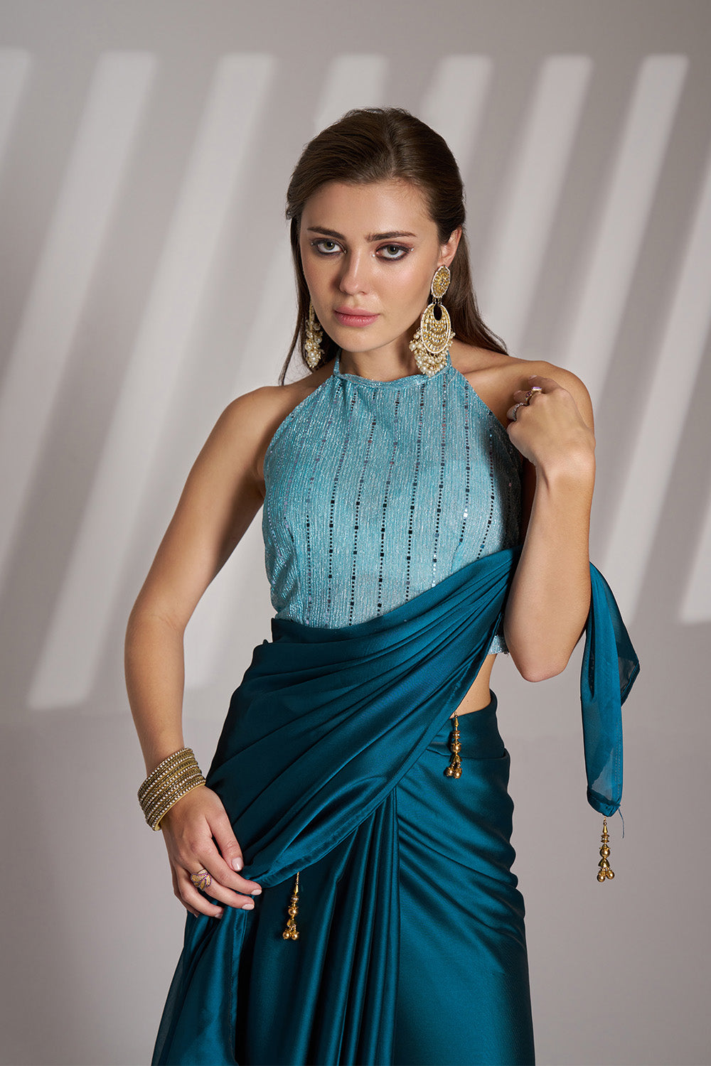 This elegant teal blue satin saree features delicate tassels and comes with an unstitched blouse. The luxurious fabric and intricate details make it a versatile and timeless addition to any wardrobe. Expertly crafted for a flawless fit, this saree offers comfort and style in equal measure.