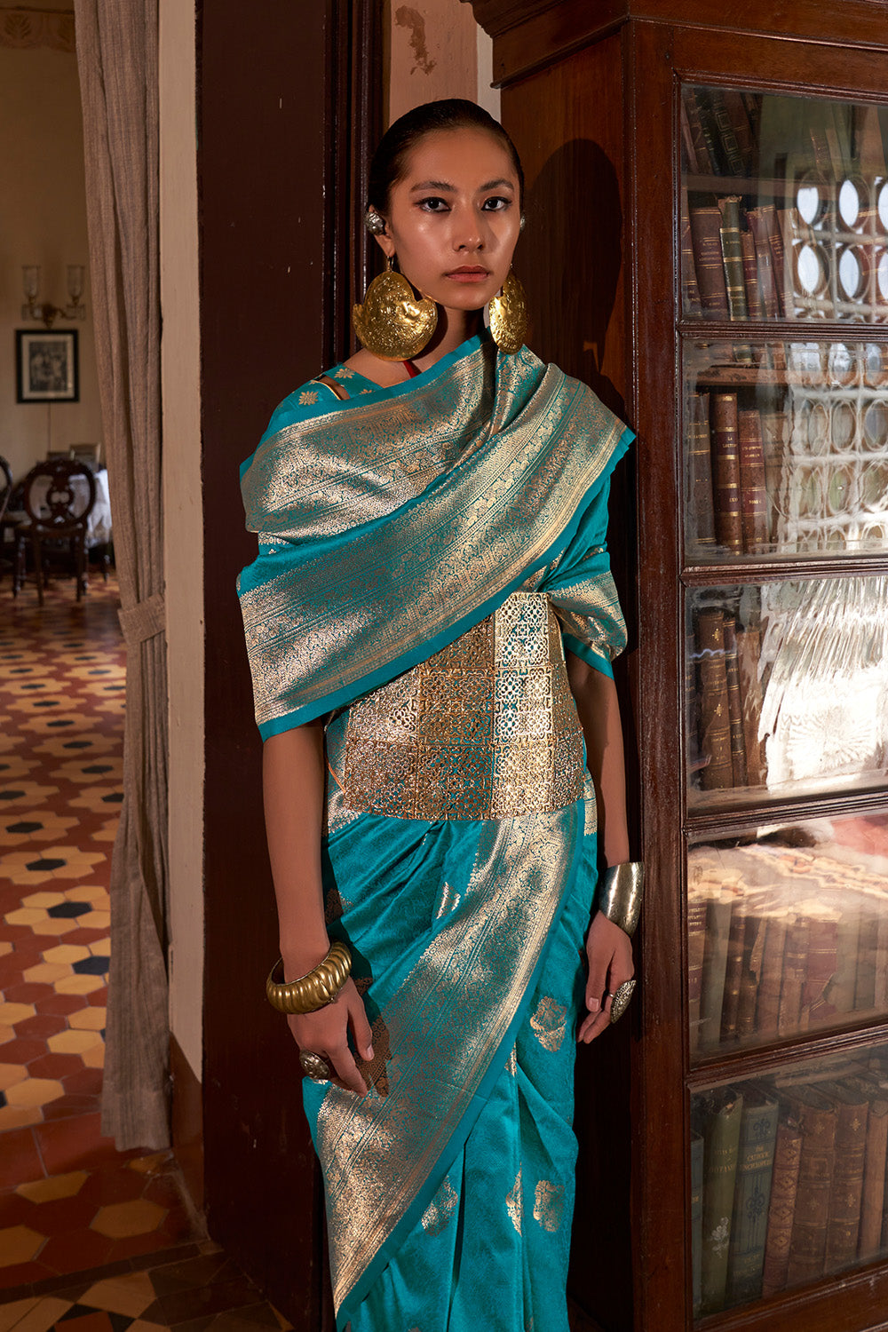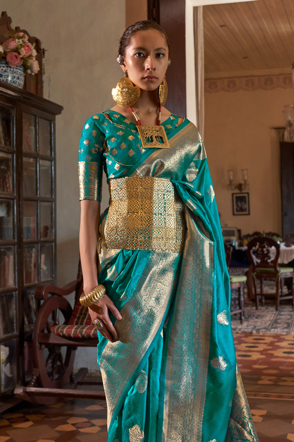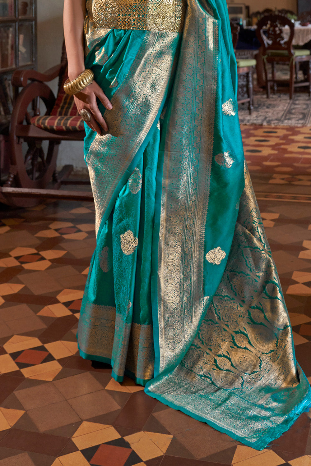 Teal Green Two Tone Saree With Brocade Blouse
