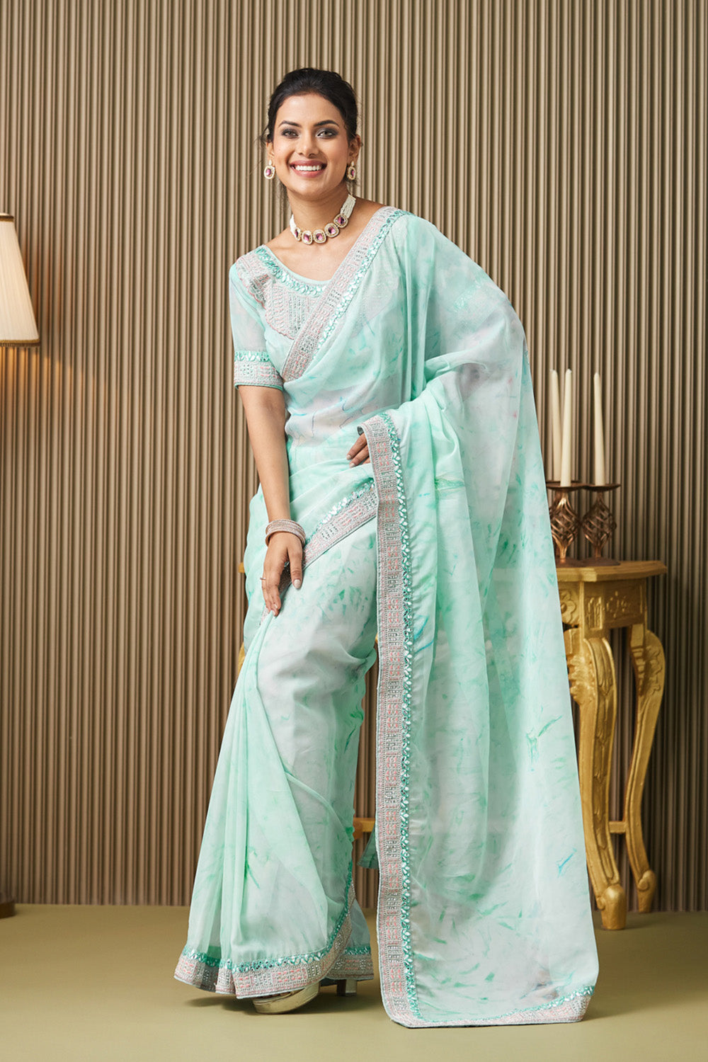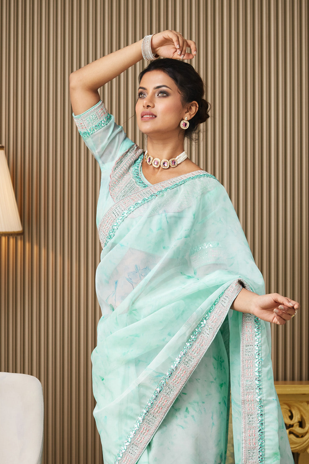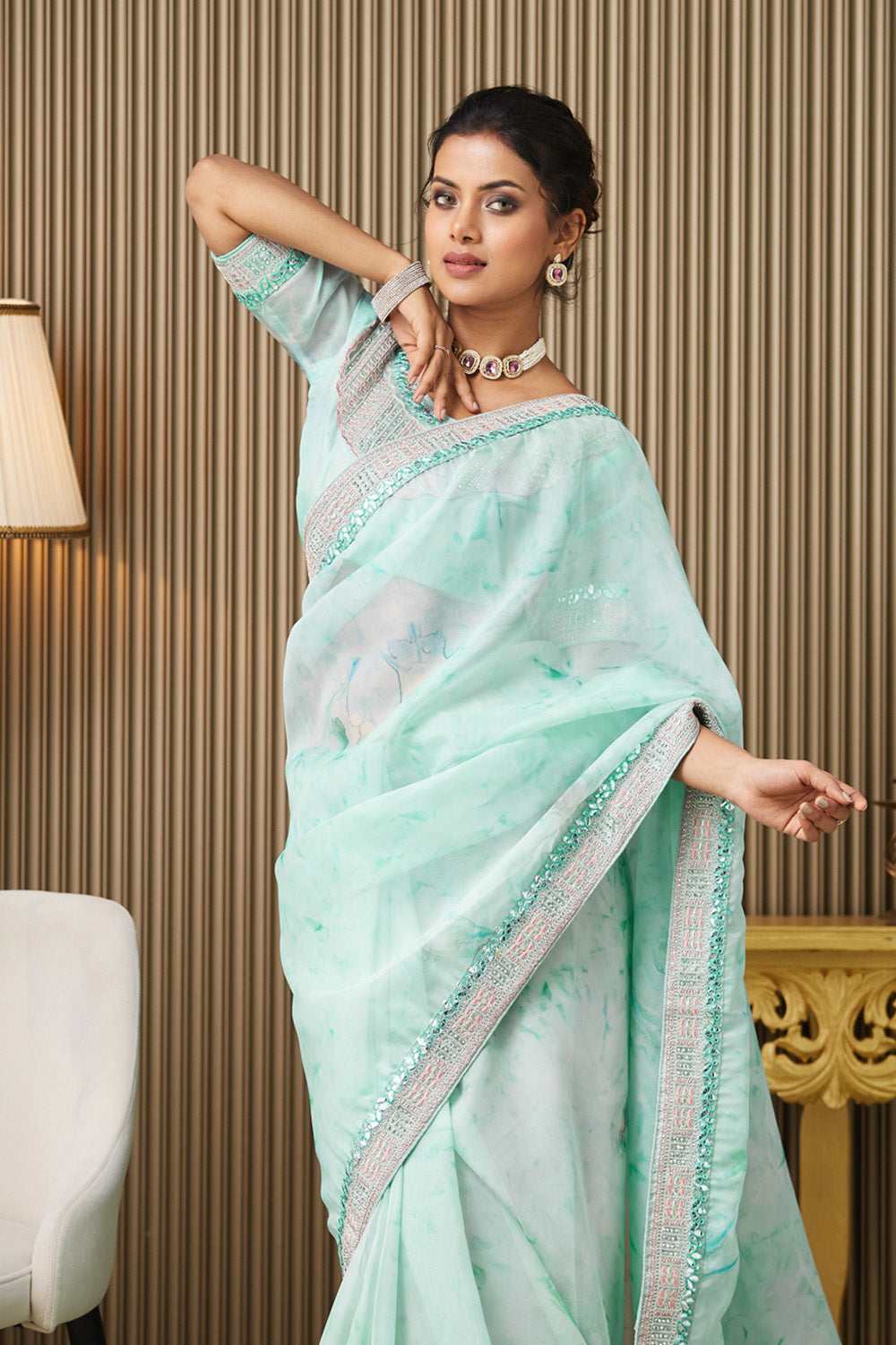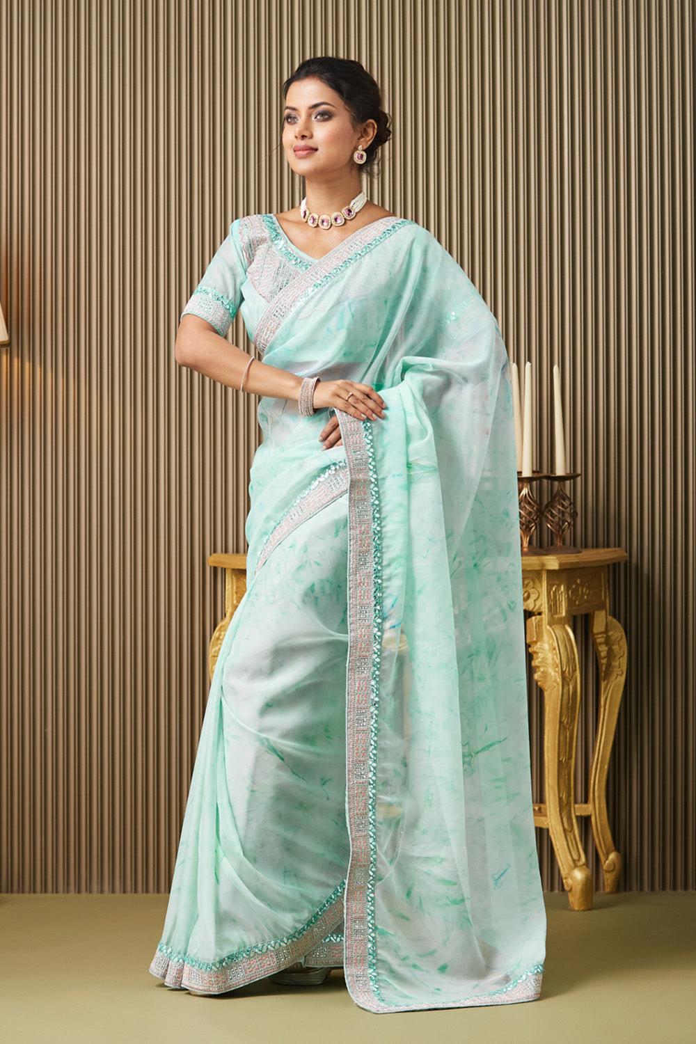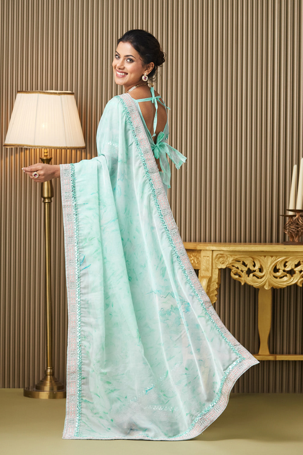 Turquoise Blue Embroidered Organza Saree With Blouse