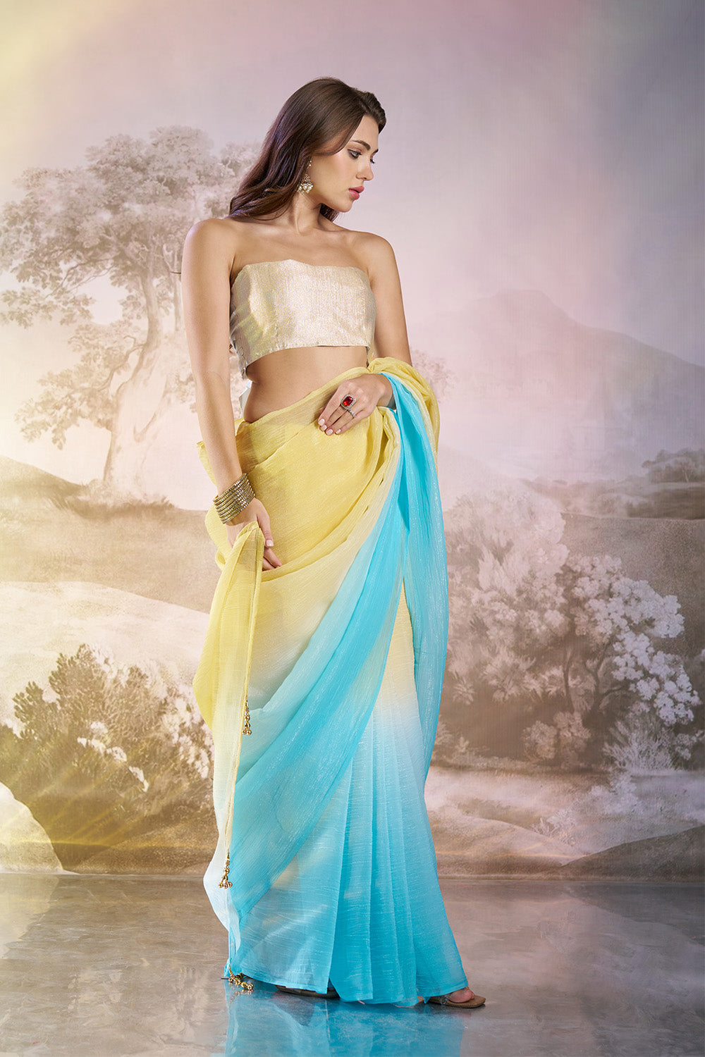 Expertly crafted from delicate chiffon, this yellow saree features tassel details for a touch of elegance. Comes with an unstitched blouse for a customizable fit. Lightweight and easy to drape, perfect for any occasion. Elevate your wardrobe with this must-have piece.