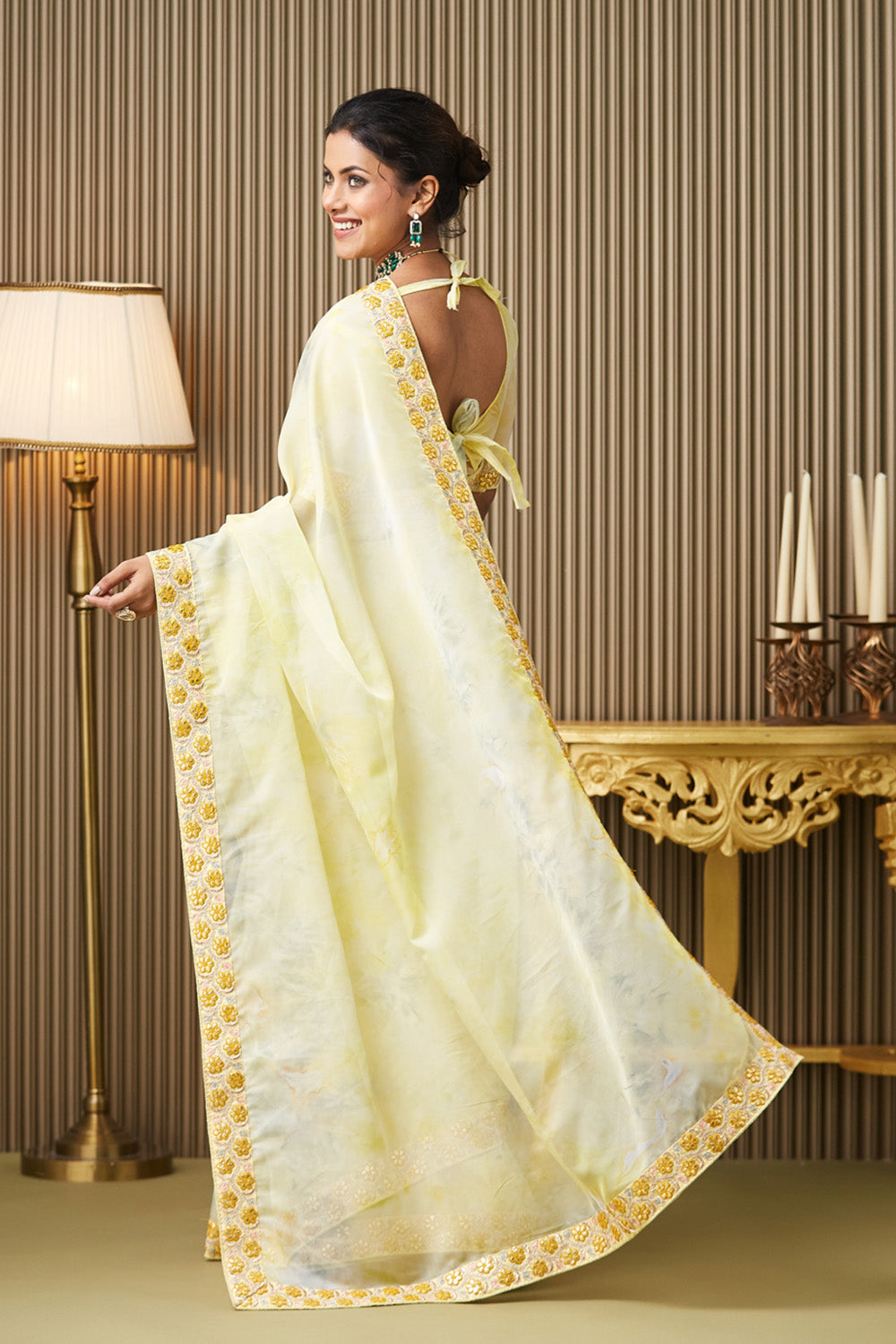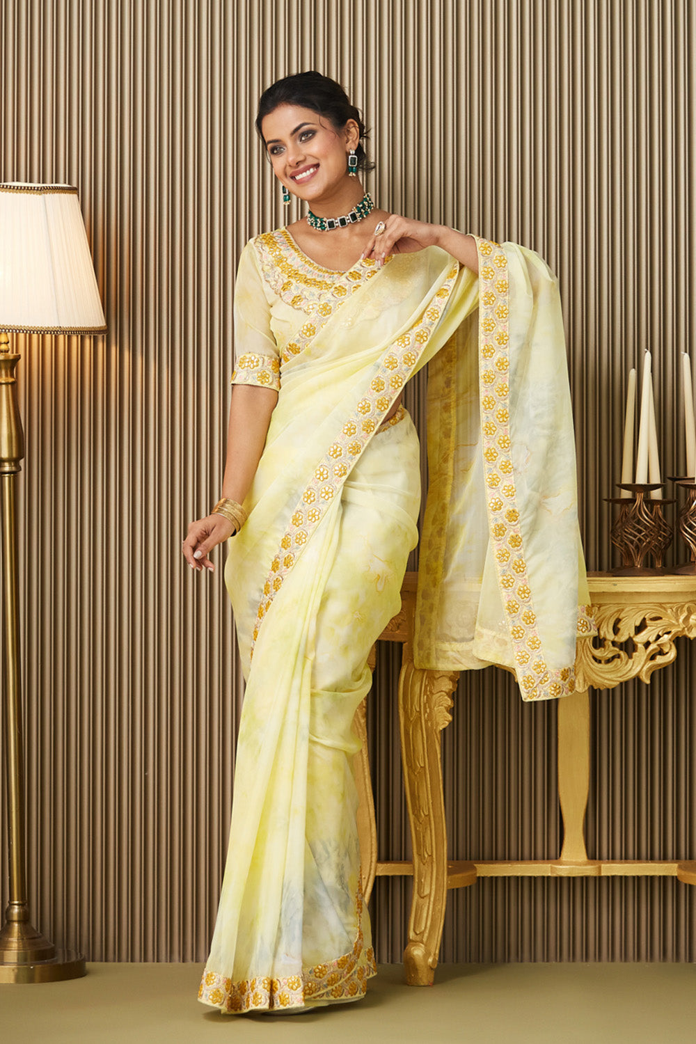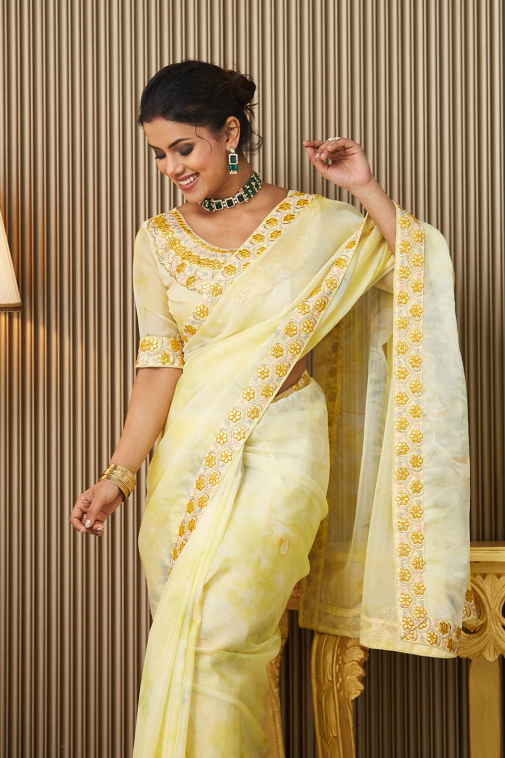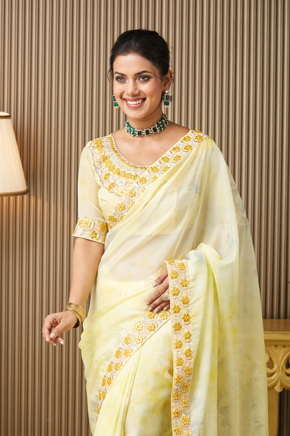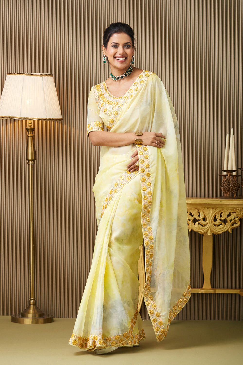 Elevate your traditional wardrobe with this Yellow Embroidered Organza Saree, paired with a matching blouse. Crafted from lightweight organza fabric, it offers a delicate sheer texture that drapes gracefully. The intricate embroidery adds refined elegance, making it ideal for festive occasions and formal events. This saree combines classic charm with contemporary style, ensuring a sophisticated and comfortable wear experience.
